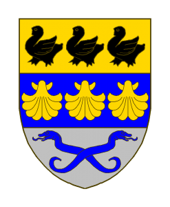 Coupé d’or et d’argent, à la fasce d’azur brochant, chargé de trois coquilles d’or, accompagnée en chef de trois merlettes de sable, et en pointe de deux guivres ou serpents d’azur mis en sautoir.