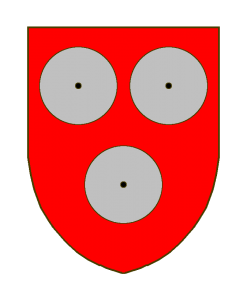 De gueules à trois besants d’argent, centrés par un point de sable.