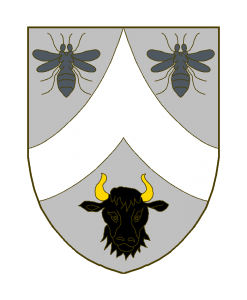 D’argent au chevron ployé de …, accompagné en chef de deux abeilles au naturel, en pointe d’un rencontre de buffle de sable, accorné et bouclé d’argent.