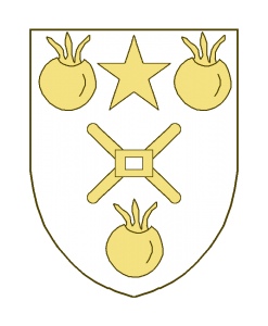 Une anille surmontée d’une étoile et accompagnée de trois (grenades, pommes de pin, bombes?) l’anille a aussi une forme spéciale.