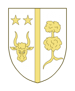 Parti par un filet en pal: A dextre un rencontre de boeuf surmonté de deux étoiles, à sénestre un arbre arraché à deux étages.