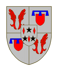 Écartelé: aux I et IV d’argent à deux saumons adossés de gueules, aux II et III d’argent à l’écusson de gueules, au lambel à trois pendants d’azur ; sur le tout d’argent à trois losanges de gueules, accompagnées de trois étoiles à six rais mal ordonnées de sable.