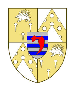 Écartelé: aux I et IV à trois clous en pal, posés 2 – 1 [sumonté d’un hérison], aux II et III un chevron besanté. Sur le tout, comme ci-dessus.