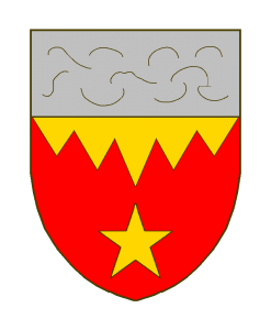 De gueules à l’étoile d’or, au chef pointillé d’argent, surnuagé et cannelé d’azur.