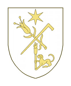 Un lis au naturel, tigéet feuillé, et une canne (?) en sautoir, accompagnés en chef d’une étoile à six rais, en pointe d’un chien accroupi, tenant un flambeau.