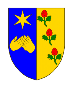 Parti au I d’azur à deux mains droites jointes en chevron d’or, surmontées d’une étoile à six rais du même, au II d’or à trois fraises de gueules, tigées et feuillées de sinople, posées en pal, rangées en barre.
