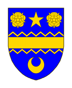 D’azur à une divise d’or entre deux filets vivrés du même, accompagnée en chef d’une étoile entre deux roses, en pointe d’un croissant, le tout aussi d’or.
