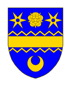 D’azur à une divise d’or, enroulée d’un filet clenche’, accompagnée en chef d’une rose accostée de deux molette, et en pointe d’un croissant, le tout d’or.