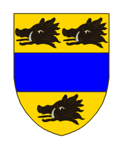 D’or à une fasce d’azur, accompagnée de trois hures de sanglier au naturel, dé-fendues d’argent, deux en chef, une en pointe.