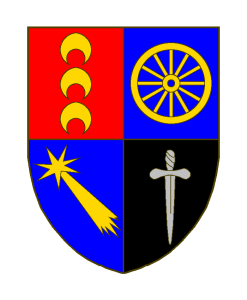 Trois échaudés en forme de croissants les pointes en bas d’or, en champ de gueules, une roue d’or en champ d’azur, une comète d’or aussi en champ d’azur, et une épée d’argent penchée en champ de sable, le tout divisé en quatre.