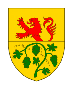 Coupé, d’or au lion issant de gueules, et d’or à la branche de vigne courbée de sinople, fruitée de trois pièces.