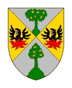 Écartelé en sautoir, le chef et la pointe d’argent à un chêne de sinople englanté d’or, planté sur un rocher, les flancs d’or à un phénix au naturel, sur un bûcher en flammes du même.