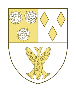 Coupé, au I parti, à dextre à trois roses, à sénestre à trois losanges, au II à trois poissons, dont l’un en pal, broche sur les deux autres en sautoir.