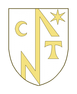 Une pièce en pal en forme de crampon contourné, joignant le chef et la pointe, accompagnée à dextre; accompagnée à dextre d’une lettre C en forme de croissant, à sénestre d’une étoile à six rais en chef, et d’un écu.