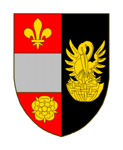 Parti au I de gueules à la fasce d’argent accompagnée en chef d’une fleur de lis d’or, en pointe d’une rose du même au II de sable au pélican et sa pitié d’or.