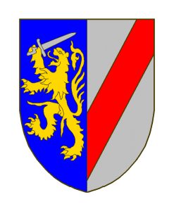 Parti au I d’azur au lion d’or, brandissant de la dextre une épée d’argent, au II d’argent à une barre de gueules.