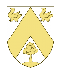 Un chevron, accompagné en chef de deux merlettes, en pointe d’un arbre terrassé .