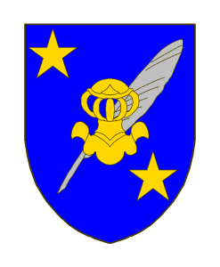 D’azur à un casque d’or taré de front traversé par derrière d’une plume à écrire d’argent posée en barre, accompagnée aux premier et quatrième canton de deux étoiles aussi d’or.