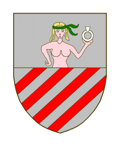 Coupé, en chef d’argent à une femme de carnation issante, la tête tortillée de sinople et tenant un anneau de la main gauche, en pointe d’argent à quatre barres de gueules.