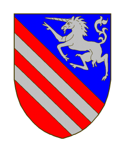 Tranché: en chef d’azur à une licorne rampante d’argent, en pointe de gueules à deux bandes d’argent (ou Bandé d’argent et de gueules).