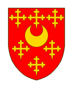 De gueules au croissant montant d’or, accompagné de six croisettes recroisettées, au pied recroisetté et fiché, du même, trois en chef, trois en pointe.