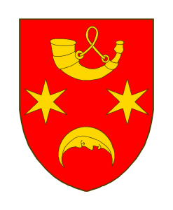 De gueules au cor virolé d’or en chef, un croissant figuré versé en pointe du même, et deux étoiles à six rais aussi du même aux flancs.
