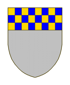 D’argent au chef échiqueté d’or et d’azur de trois tires.