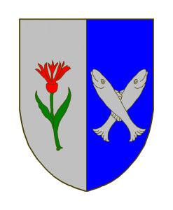 Mi-parti, à dextre d’argent à l’oeillet de gueules, feuillé et tigé de sinople en pal, à sénestre d’azur à deux poissons d’argent contrepassés en sautoir, au chef d’or à trois roses de gueules, boutonnées du même métal en fasce.
