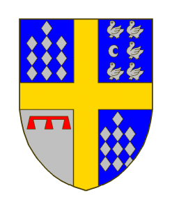 D’azur à la croix d’or cantonnée aux I et IV de dix losanges d’argent, 1-3-3-3, au II de cinq merlettes du même 2-1-2, la seconde accostée à dextre d’un croissant du même, au III d’argent au lambel de gueules en chef.