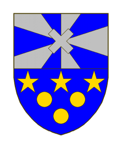 Coupé, en chef Gironné de six pièces d’azur et d’argent, au flanchis brochant, d’argent; en pointe d’azur à trois étoiles d’or rangées en fasce accompagnées en pointe de trois besants d’or.