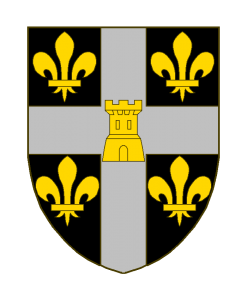 De sable à la croix d’argent, accompagnée de quatre fleurs de lis d’or. brisée en coeur d’une tour aussi d’or.