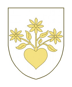 Un coeur, de la boucle duquel issent trois fleurs à huit pétales, tigées et feuillées.