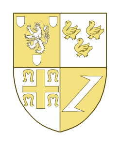 Écartelé: au I un lion couronné, accompagné de trois écussons, deux en chef, un en pointe, au II trois merlettes, au III une croix alésée cantonnée de quatre fers à cheval, au IV un crampon en barre.