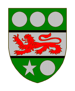 De sinople à la fasce d’or bordé de sable, chargé d’un lion passant de gueules, accompagnée en chef de trois besants d’argent, en pointe d’un besant et d’une étoile, aussi d’argent, rangés en fasce.