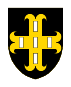 De sable à la croix ancrée d’or, chargé de 5 billettes.