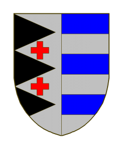 Parti à dextre parti-emmanché de sable et d’argent, chargé au second et troisième d’une croisette de gueules; à sénestre fascé d’azur et d’argent.