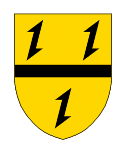 D’or à la fasce en divise de sable, accompagnée de trois crampons du même.