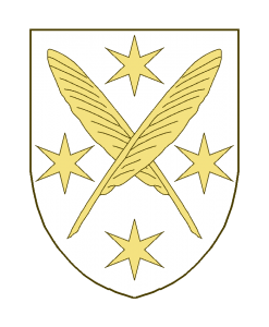 Deux plumes à écrire en sautoir, les pointes en bas, cantonnées de quatre étoiles à six rais.