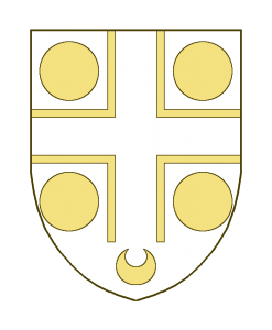Une jumelle de croix raccourcie en bas, cantonnée de quatre besants ou tourteaux, et accompagnée en pointe d’un croissant.