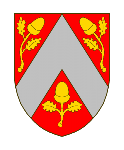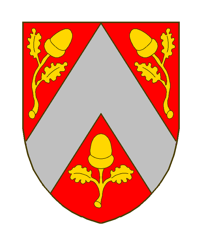 Der Schild ist blau, der Sparren rot, die Eicheln ebenso angeordnet, aber die Blätter grün, Zweige und Eicheln braun.