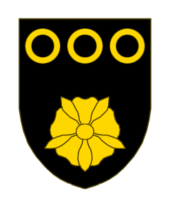 De sable à trois annelets d’or en chef, rangés en fasce, une «rose quintefeuille» du même en pointe.