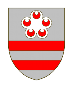 D’argent à deux fasces de gueules accompagnées en chef de cinq croissants montants de gueules dans une lunette en forme de rose.