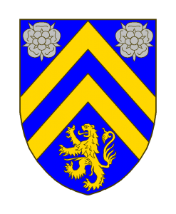 D’azur à deux chevrons d’or, accompagnés en chef de deux roses d’argent, en pointe d’un lion d’or.