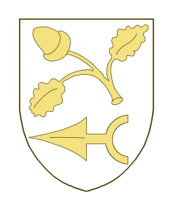 En chef une branche de chêne fruitée d’une pièce en chef, feuillé de deux pièces, les feuilles en barre, et en pointe un fer de lance au pied terminé en cornière posé en fasce.