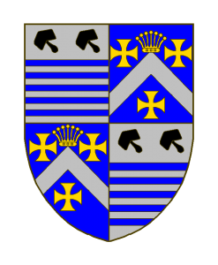 Écartelé: aux I et IV comme ci-dessus [d’argent à cinq burelles d’azur, accompagnées en chef de deux maillets couchés de sable, la manche à sénestre.], aux II et III d’azur au chevron abaissé d’argent sous une couronne à sept perles, et accompagné de trois croix pattées, le tout d’or (Elzius).