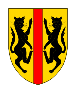 D’or au pal de gueules, accosté de deux chats rampants et affrontés de sable, la tête posée de face (ou grimpant au pal).