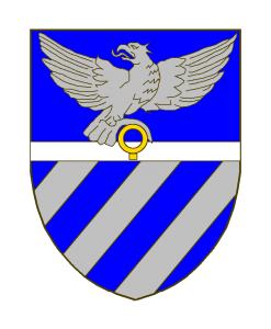 Coupé d’azur et d’azur à trois barres d’argent au filet en fasce brochant sur le coupé, accompagné en chef d’une aigle contournée, la tête visant à dextre, d’argent, perché sur un anneau à châton d’or, brochant sur la fasce