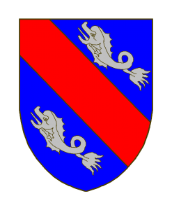 D’azur à la bande de gueules, accompagnée de deux dauphins d’argent.