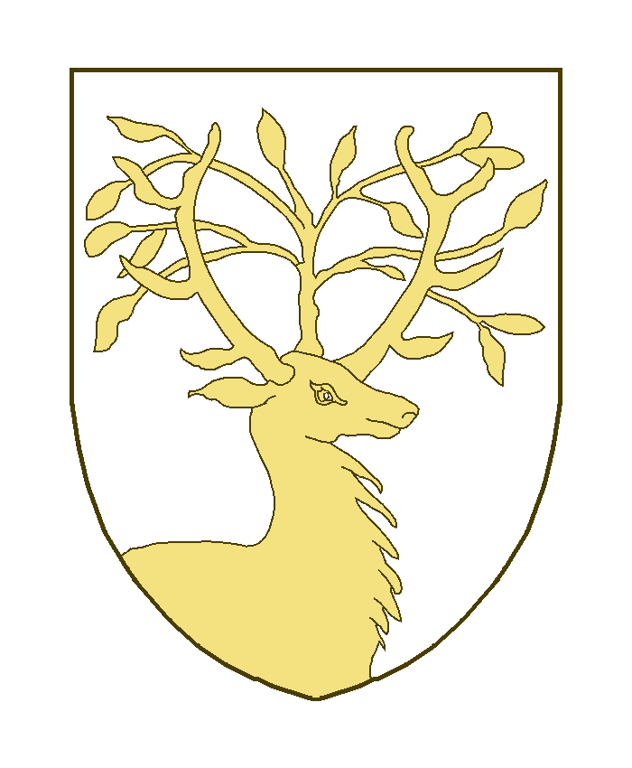 Un buste de cerf contourné issant de la pointe, portant entre les bois et s’entre-mêlant avec eux une branche feuillée (de prunier?) issant de la tête du cerf.