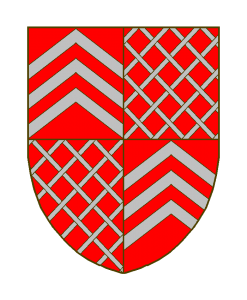 Écartelé de Raville, qui est de gueules à trois chevrons d’argent, et de Daun, qui est de gueules fretté d’argent.